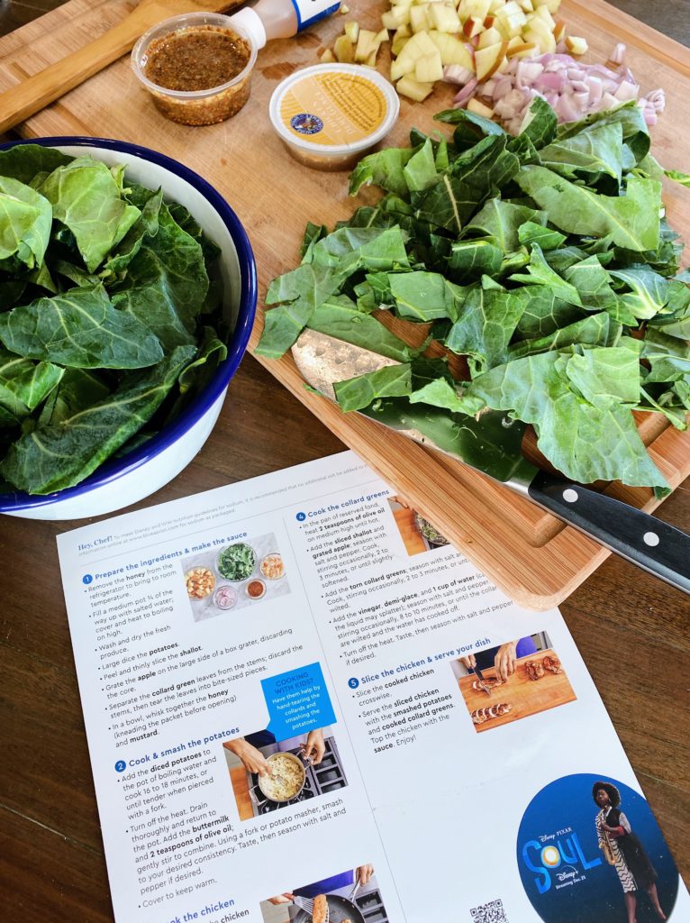 As longtime blog readers know, we’ve been Blue Apron fans in our house for years and the family-friendly meals we’ve received to celebrate Disney and Pixar’s Soul have all been easy to make and incredibly tasty. (Easy to make is key for me in this phase of life!) I personally appreciate the fact that the meals have all been well-rounded and include a decent amount of veggies since I’m always looking for new ways to prepare vegetables that taste unique and delicious! (I loved the addition of apple to the collards in last night’s dinner so much!) Also, our boys love “helping” in the kitchen all the time and were all about pulling their cooking stand up to the counter and helping me make this recipe. Chase, in particular, loved holding the recipe card and pointing out the next step for us to do together since the recipe photos made it easy for him to follow even though he’s not reading just yet!