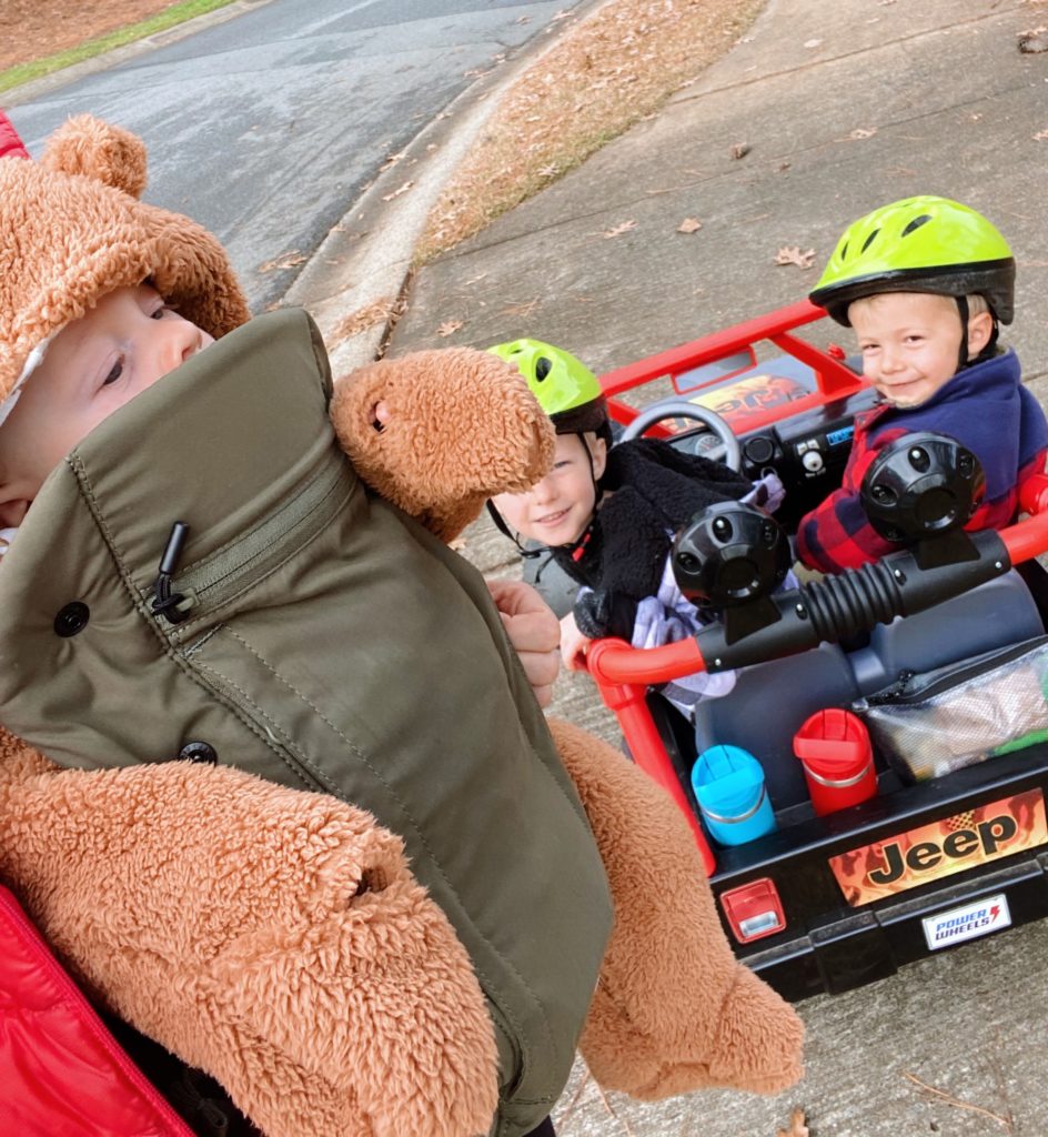 Since both Chase and Ryder are still out of school for the next two weeks, our day was wiiide open. We spent most of the morning around the house, eating breakfast, reading stories and trying unsuccessfully to get Rhett down for a nap longer than 30 minutes while Chase and Ryder played together. Eventually it was clear everyone needed to get outside, so I suited Rhett up in his way-too-cute teddy bear bunting suit and followed behind Chase and Ryder as they took turns driving their Power Wheels Jeep.