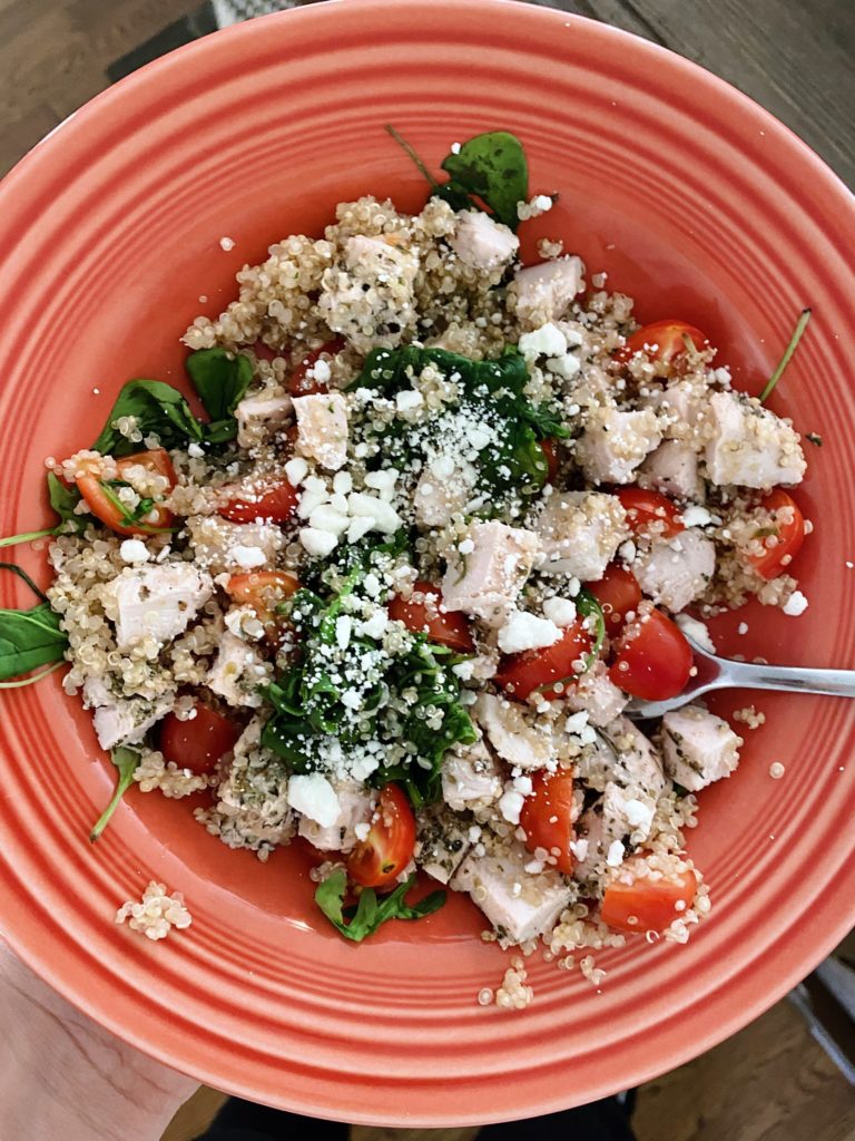 My lunch looked like a quinoa grain bowl with chicken, sliced grape tomatoes, wilted spinach and arugula and goat cheese tossed in a creamy balsamic dressing. Yum!