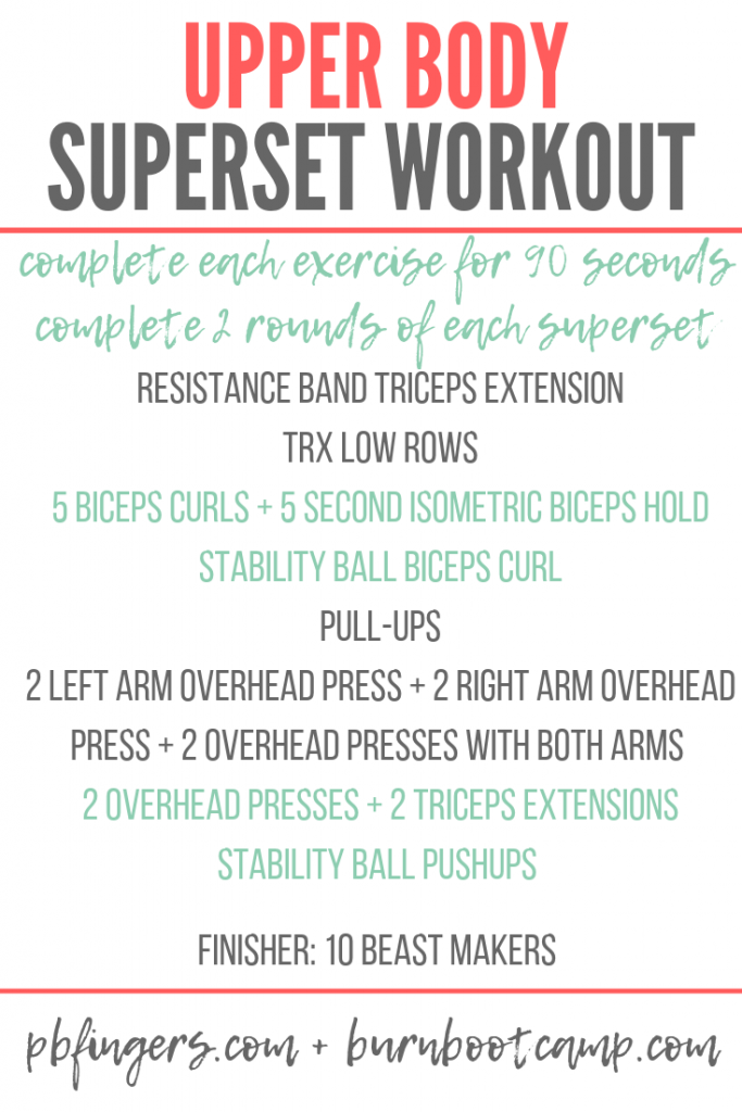 Once Chase was settled at camp, Ryder and I made our way to Burn Boot Camp! I missed my boot camp workouts a ton when I was in Florida and it felt good to be back! It was an upper body day at boot camp and we went through a superset workout that looked like this: