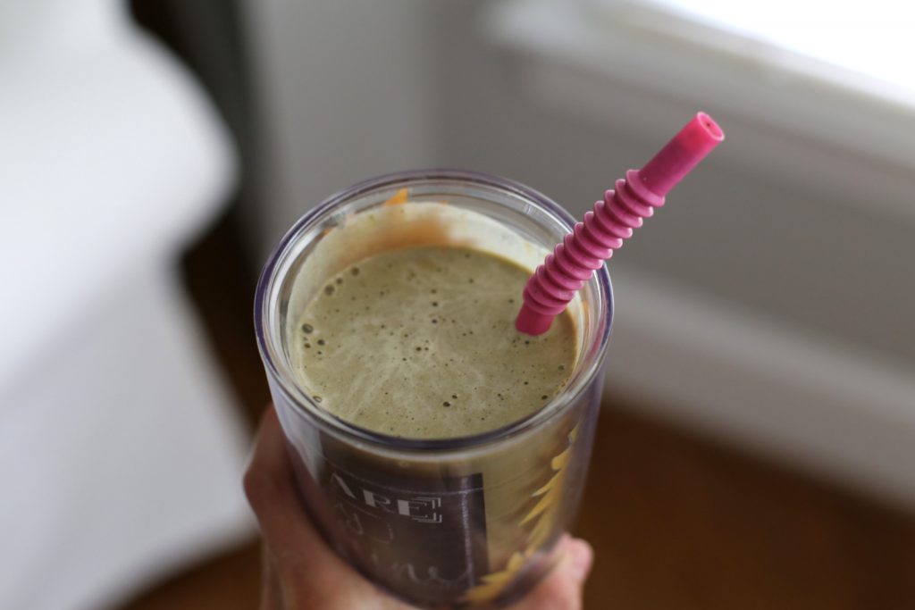 As Ryder napped, I made myself a smoothie with frozen cauliflower, chocolate protein powder, cashew butter, oats, a handful of fresh spinach and a frozen banana and sipped on it as I worked on back-end blog stuff I neglected last week.