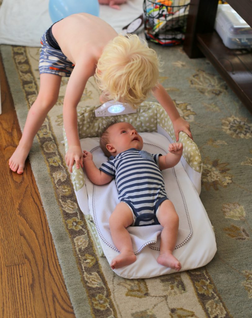 As far as how I handle naps for one of the boys when the other one is awake, needy and noisy, I try to be flexible on timing. If Ryder is crying and needs attention, Chase’s nap will get pushed back until Ryder is soothed. Ryder is thankfully still at the age where he can sleep in a rather noisy environment, so he naps in his Rock ‘n’ Play in our family room while Chase plays and it usually works out well. While this doesn’t happen every day, this strategy has actually helped get both of the boys napping around a similar time in the afternoon since Ryder is often awake for longer spurts when Chase is up and noisy and then he sleeps for longer stretches when Chase is asleep and things are calmer around him.