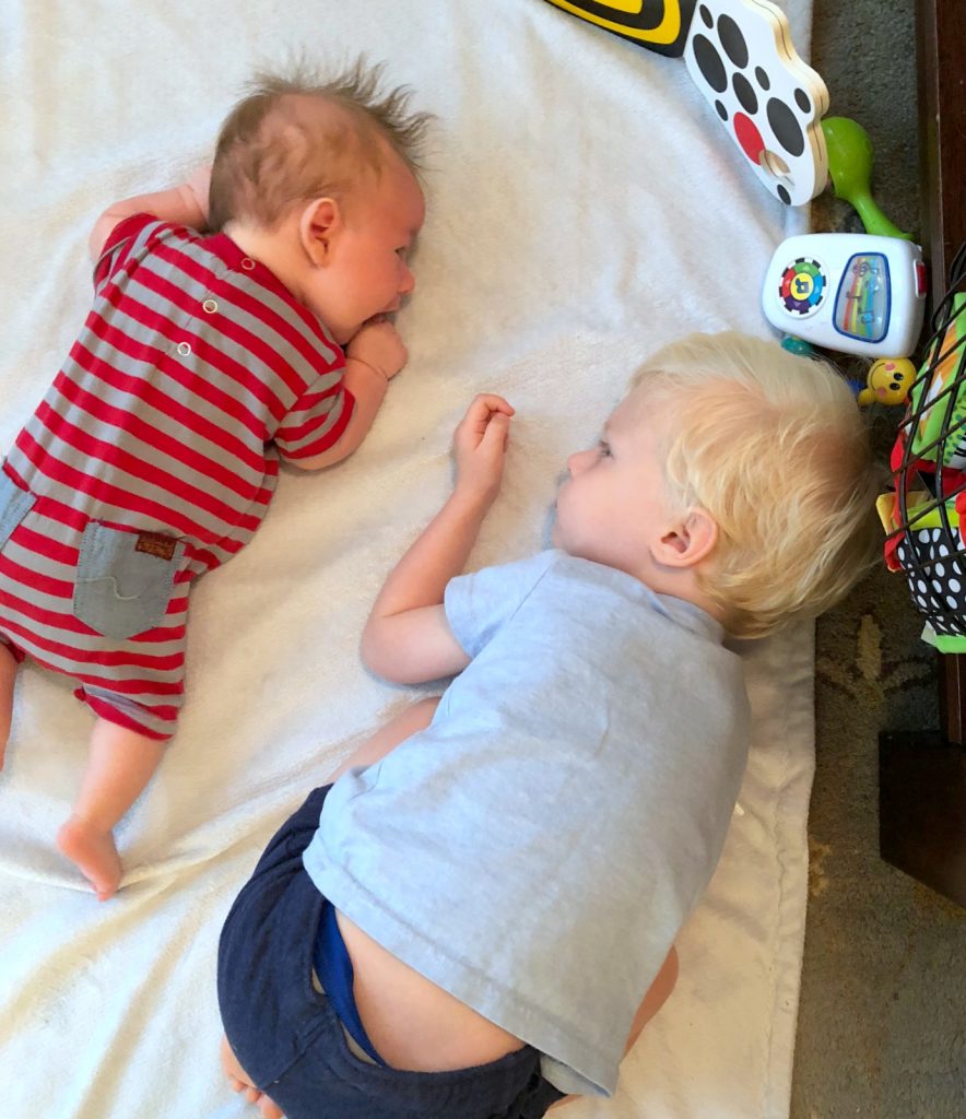 Now, on a day to day basis, things are going really well with our two boys! Chase asks me to put Ryder on a blanket on the floor for him to play with multiple times a day every day.