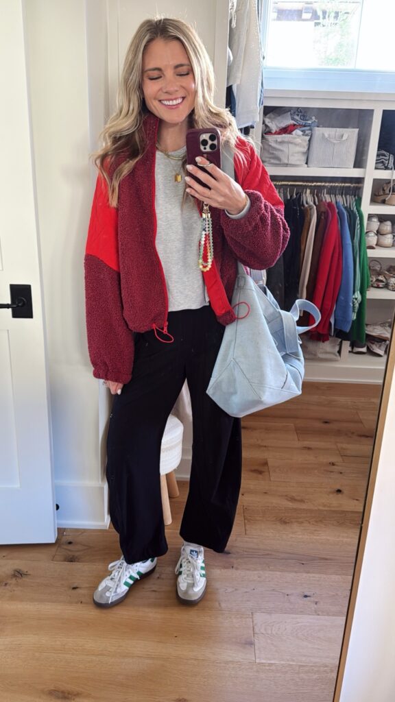 Outfit Details: Sweatshirt: aerie / Fleece: aerie / Custom Initial Bag: BaubleBar / Pants: Ruti (code PBFINGERS15 saves 15%) / Sneakers: adidas