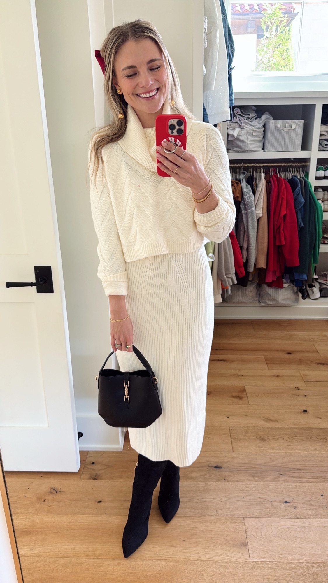 Outfit Details: Dress: White House Black Market (it’s actually two pieces!) / Boots: Jessica Simpson / Bag: Amazon (can also be a crossbody) / Earrings: Lili Lurch