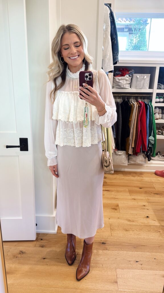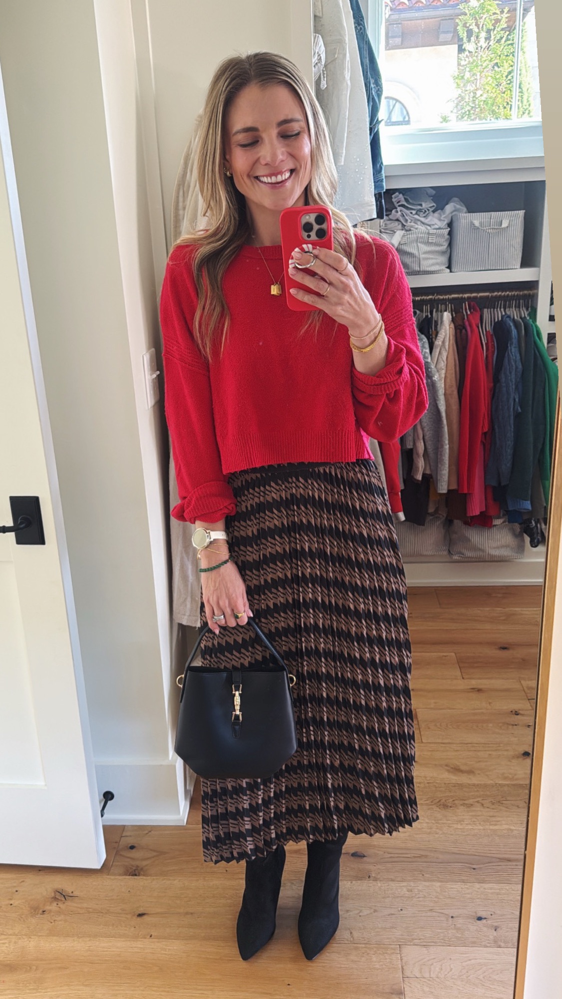 Outfit Details: Top: Francesca’s / Skirt: Target (but old — this Amazon midi skirt is similar) / Bag: Amazon / Booties: Margaux (gifted) / Large Hoops: Gorjana