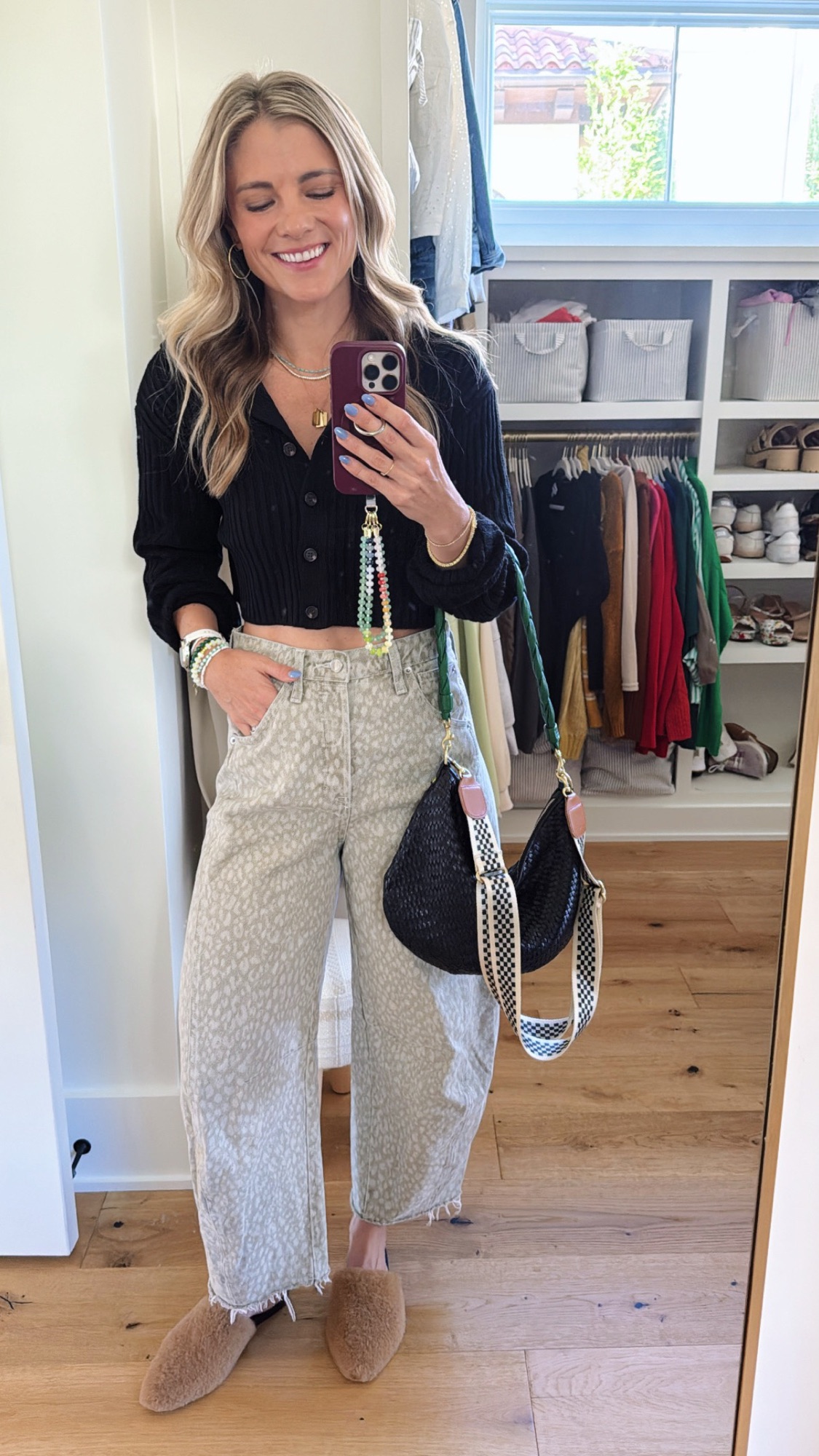 Outfit Details: Jeans: Target (the leopard print is out of stock, but they’re the same jeans I have and love in 3 washes. Size down!) / Sweater: Talulah (but old) / Mules: Jenni Kayne (I got them free with an Oak Essentials beauty purchase — this Target pair is similar) / Bag: Clare V. / Hoop Earrings: Gorjana