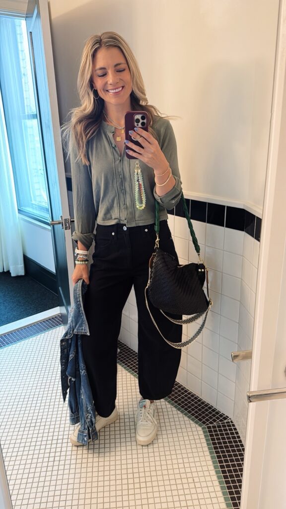 Outfit Details: Jeans: Target (size down!) / Top: aerie (I sized up 2 sizes for a loose/less cropped fit) / Sneakers: Reebok (the “top chalk” color is so comfy — I’ve walked 20k steps in one day in them with zero issues!) / Bag: Clare V. / Hoop Earrings: Gorjana / Denim Jacket: Anthropologie