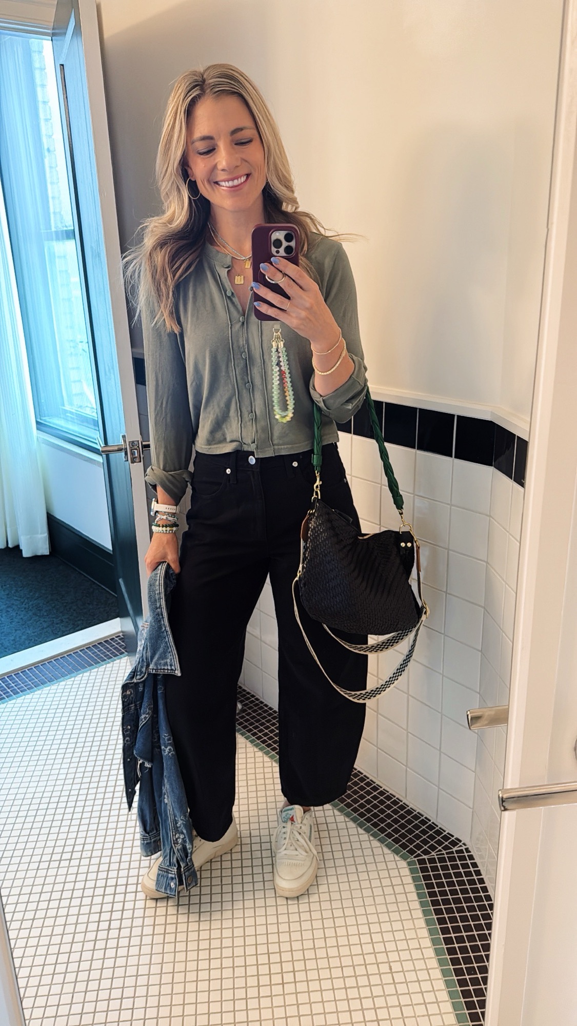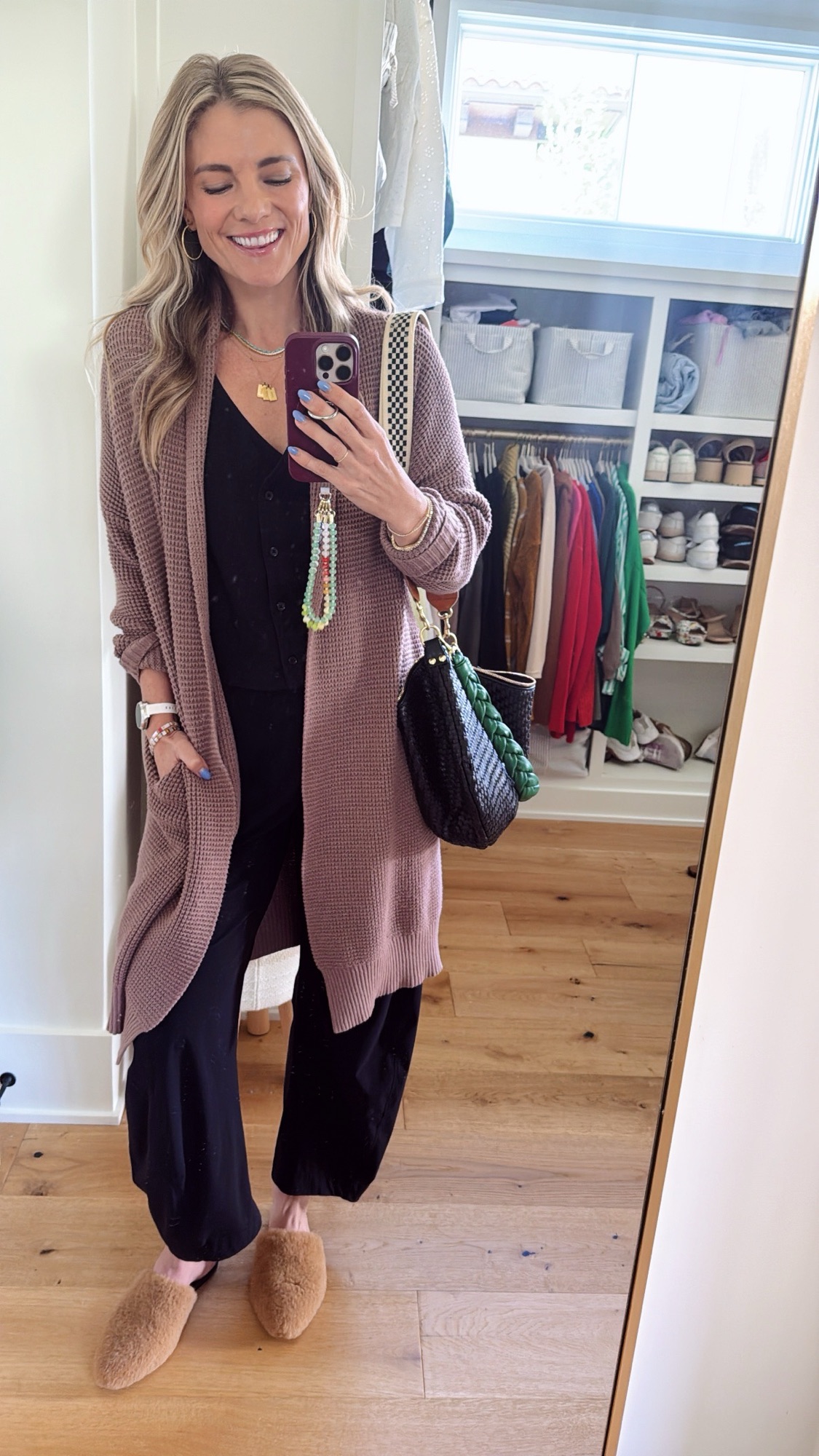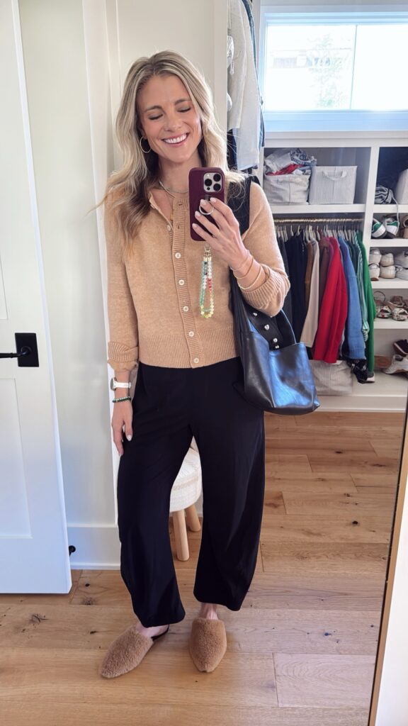 Outfit Details: Cardigan: Aerie / Pants: Ruti (code PBFINGERS15 saves 15%) / Mules: Jenni Kayne (I got them free with an Oak Essentials beauty purchase — this Target pair is similar) / Bag: Clare V. (gifted) / Hoop Earrings: Gorjana