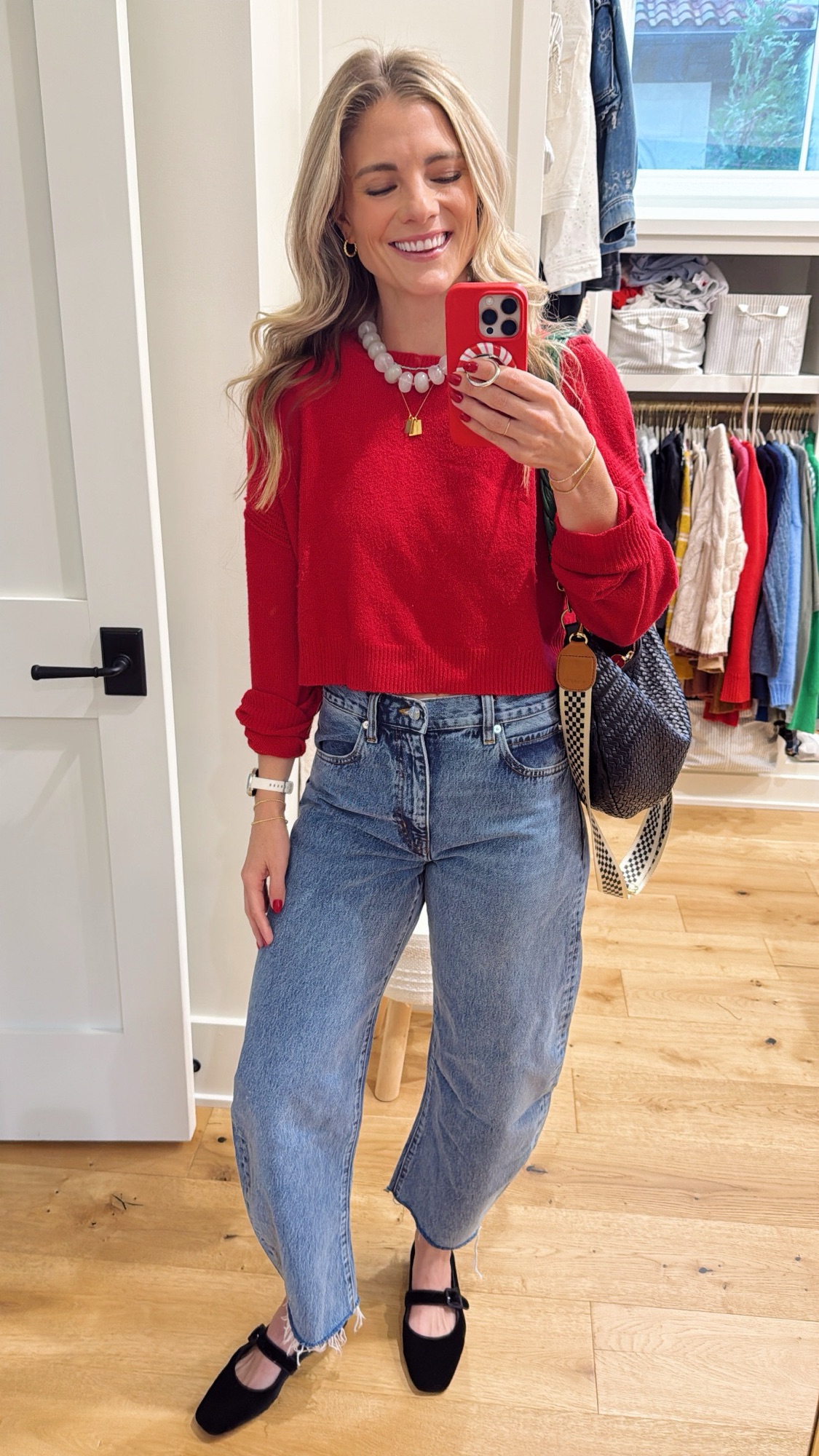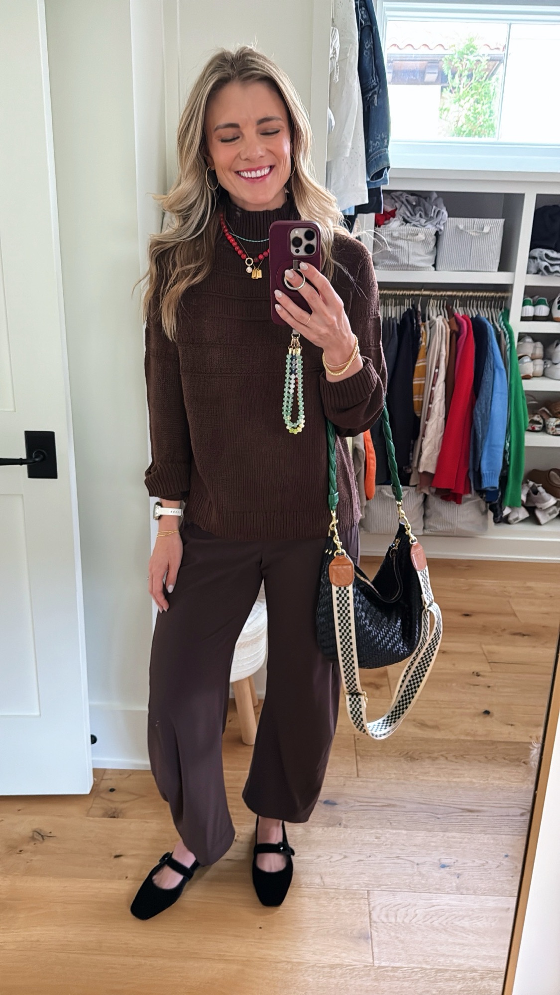 Outfit Details: Sweater: Amazon / Pants: Ruti (code PBFINGERS15 saves 15%) / Shoes: J.Crew Factory / Bag: Clare V. / Red Beaded Necklace: Bauble Bar / Hoop Earrings: Gorjana