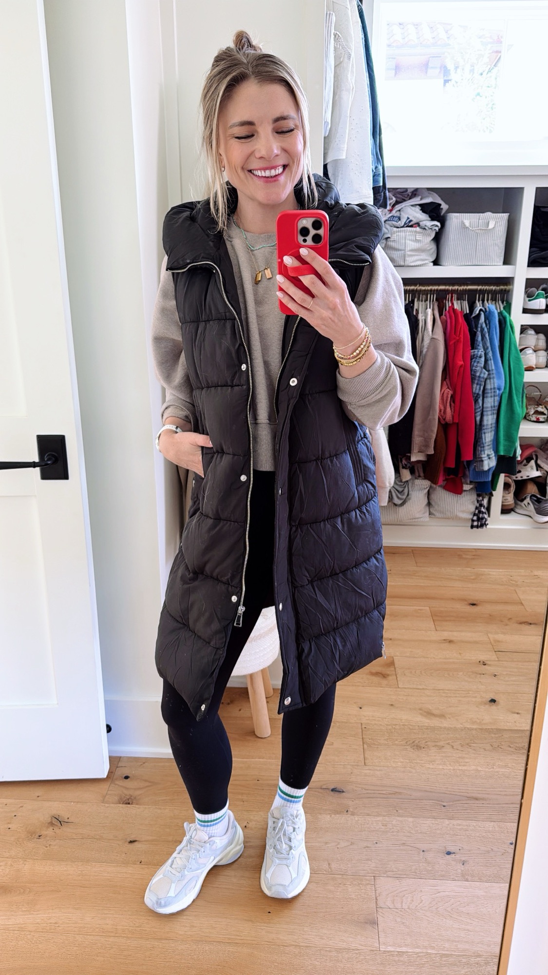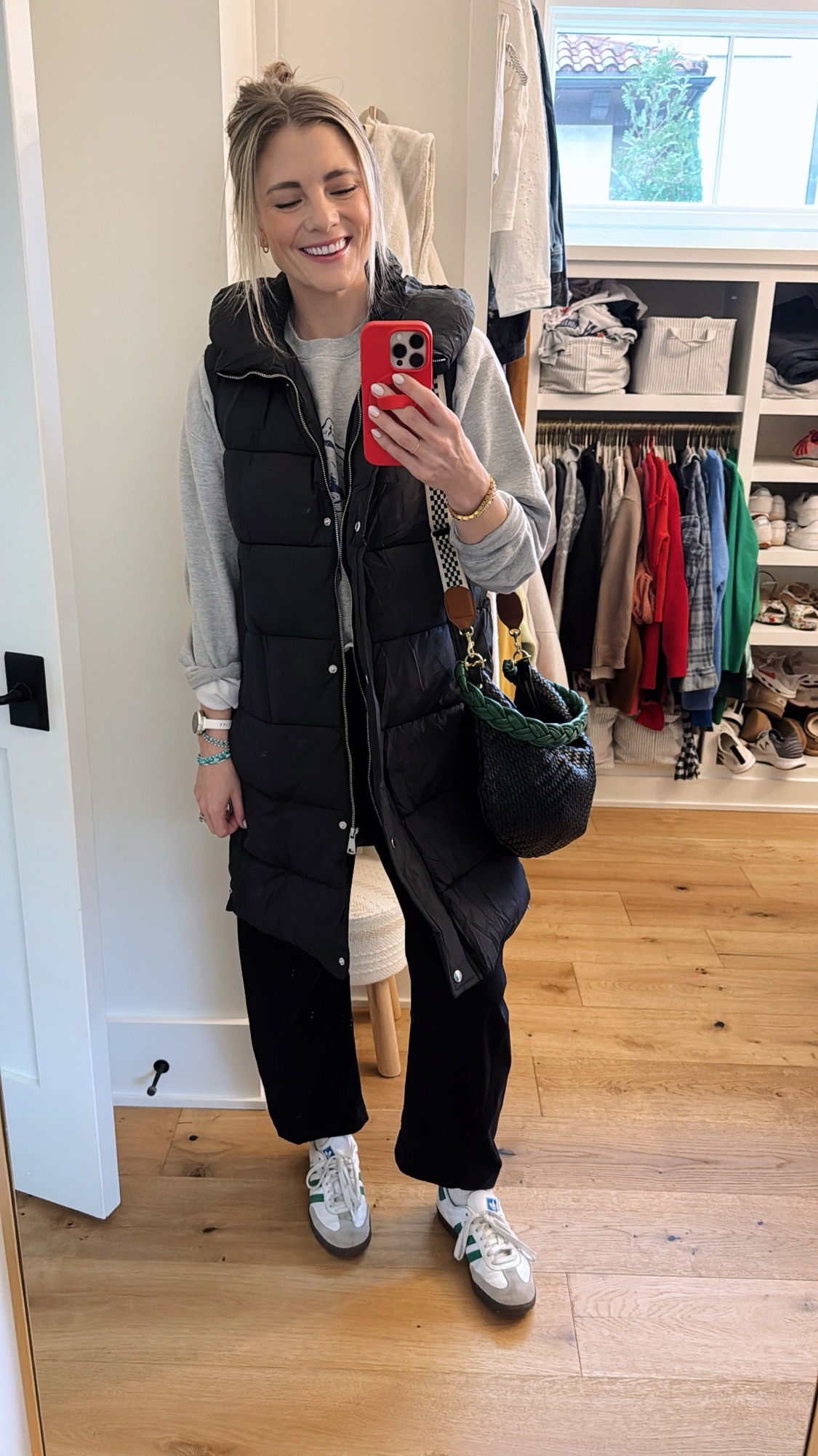 Outfit Details: Long Puffer Vest: Amazon / Pants: Ruti (code PBFINGERS15 saves 15%) / Sneakers: adidas / Bag: Clare V.