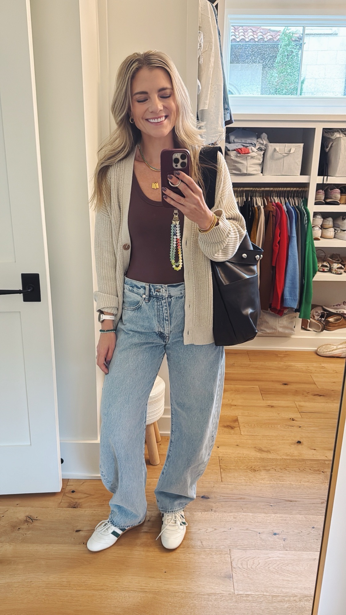 Outfit Details: Boyfriend cardigan: Quince / Bodysuit: Nuuds (code JULIEF10 saves 10%) / Jeans: FRAME (I sized down + code PBFINGERS15 saves 15%) / Sneakers: adidas (I find these comfier than my Sambas! Sizing is the same as Sambas — 1/2 size down) / Bag: Clare V.