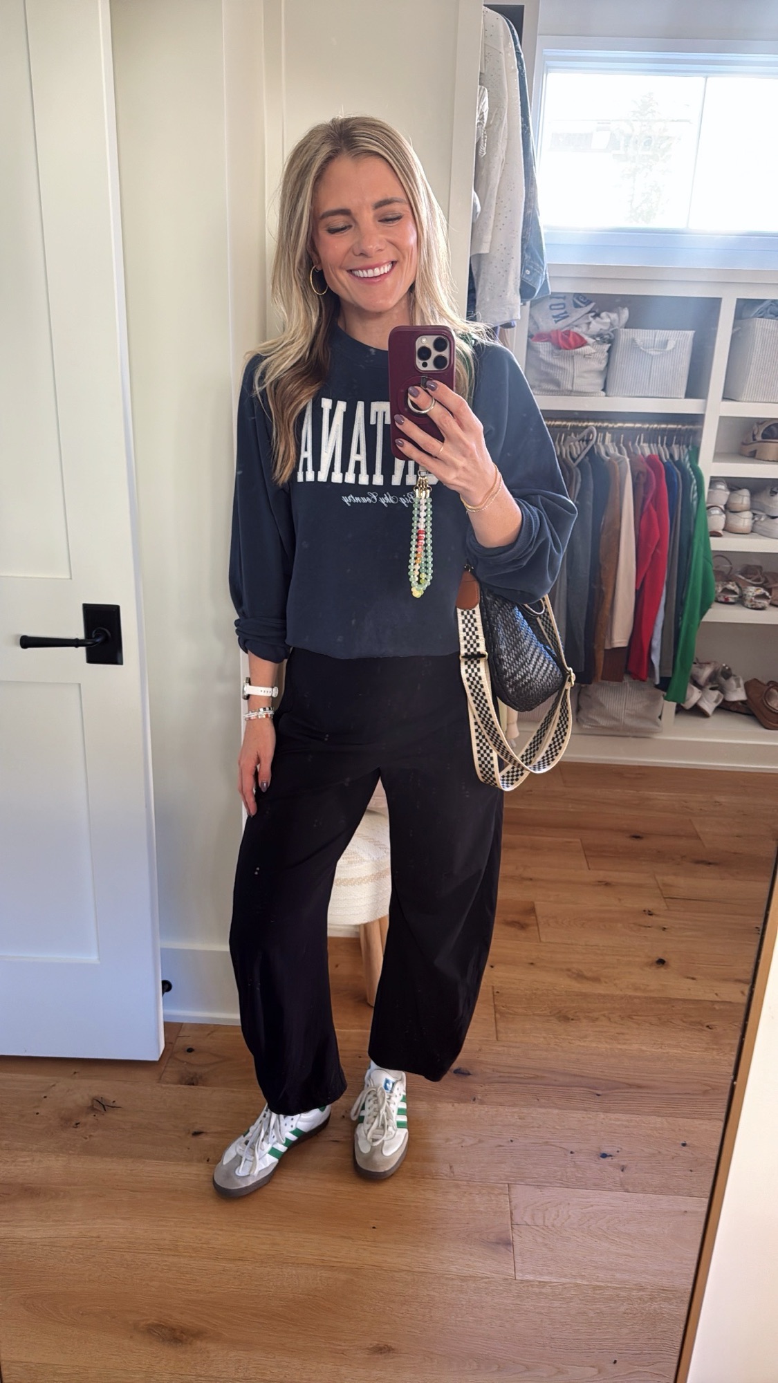Outfit Details: Sweatshirt: Old Navy (I sized up and cropped it myself by cutting off the bottom band — currently on sale in a bunch of colors) / Pants: Ruti (code PBFINGERS15 saves 15%) / Sneakers: adidas / Bag: Clare V. / Hoop Earrings: Gorjana