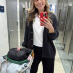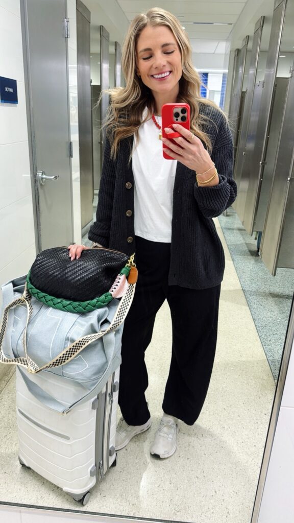 Outfit Details: Cardigan: Quince (same one I have in cream above!) / T-shirt: Amazon / Pants: Ruti (code PBFINGERS15 saves 15%) / Bag: Clare V. / Suitcase: Samsonite / Custom Initial Tote Carryon Bag: BaubleBar / Red Beaded Necklace: BaubleBar / Sneakers: On Cloud (but old)