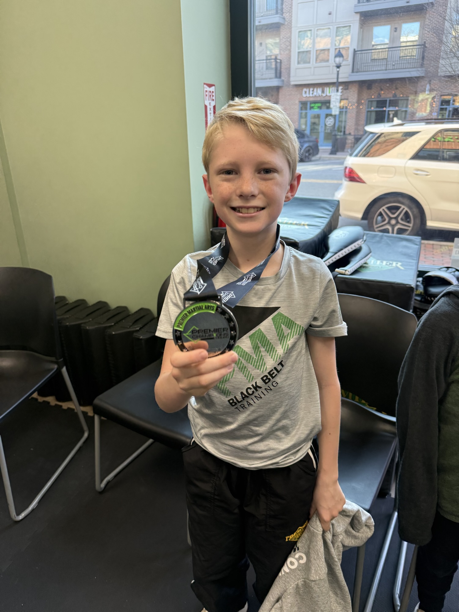 After our puppy intro session, we high-tailed it to the boys’ martial arts studio where Chase had a flag sparring tournament. In flag sparring, competitors compete to try to take 3 flags off of a belt on their opponent’s waist through two 30-second rounds. If all 3 flags are taken, they move onto “sudden death” and the first flag taken wins.