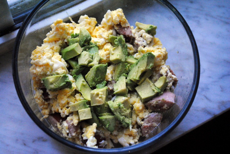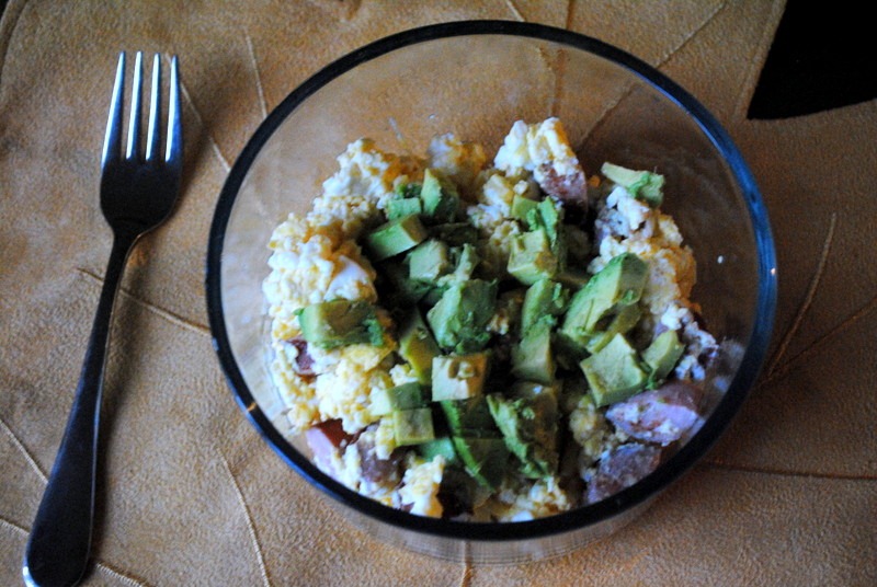Breakfast this morning included scrambled eggs, sausage and half of an avocado.