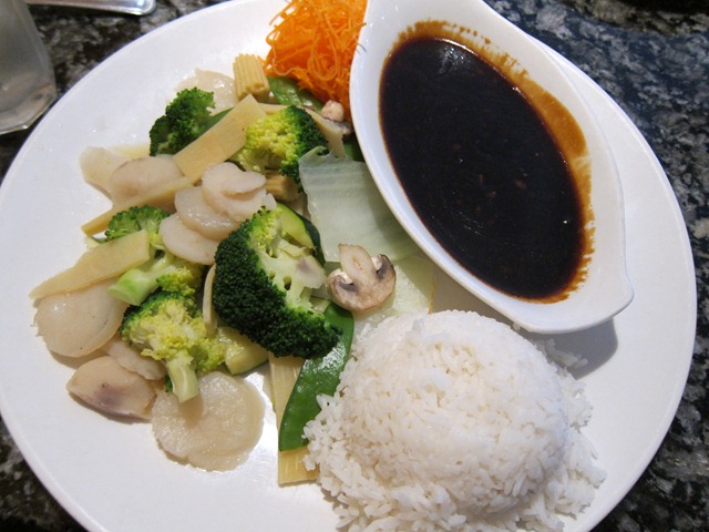I ordered the steamed scallops and mixed veggies with brown sauce.