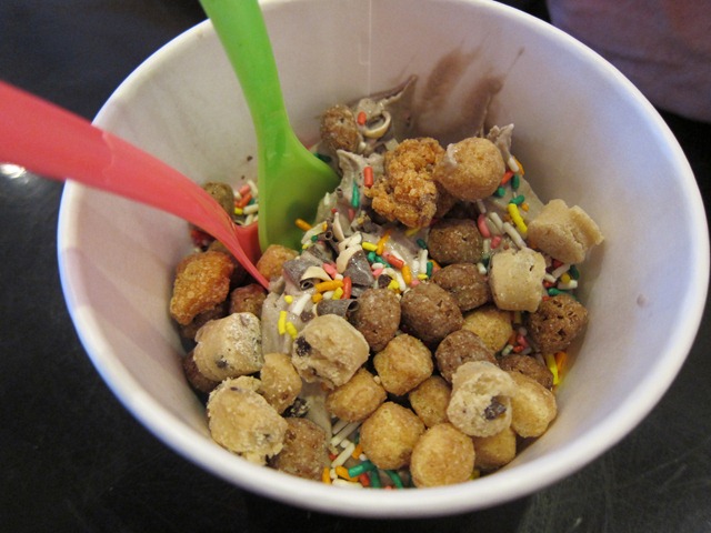 I let Ryan pick the fro yo flavor and I handled the toppings. Ryan went with cookies ‘n’ cream and I topped it with Reese’s cereal, Butterfinger bits, cookie dough pieces, Andes chocolate shavings and rainbow sprinkles. You gotta have the sprinkles. Don’t forget, they make life better.