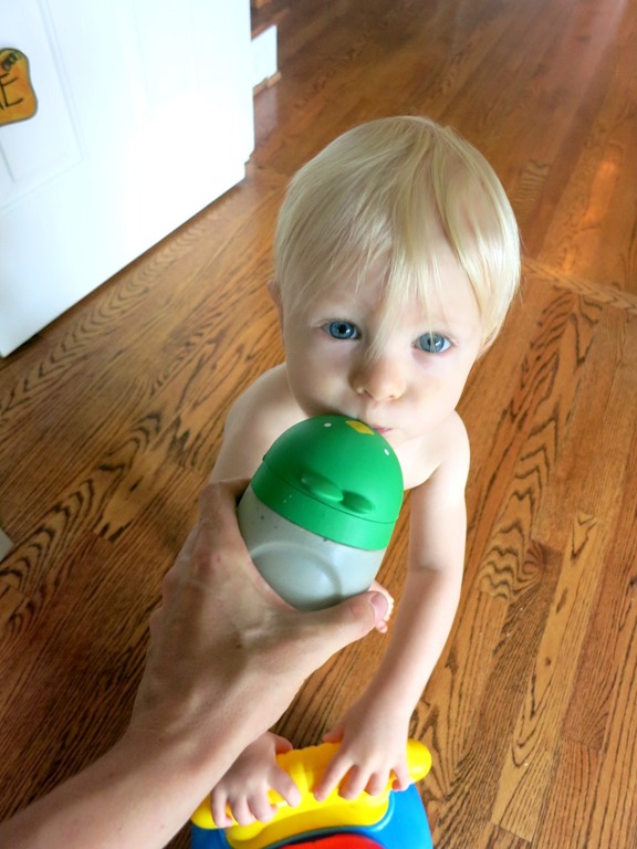 When I heard Chase begin to stir upstairs, I quickly whipped up a smoothie for us to share (a big cup for me and a Lollacup for Chase) and combined whole milk, spinach, blueberries, almond butter, avocado and frozen banana. Chase wanted nothing to do with his highchair yesterday morning so he got breakfast on the go while I followed him around and gave him lots of sneaky smoothie sips until he was ready for a Greek yogurt whole wheat muffin in the high chair.