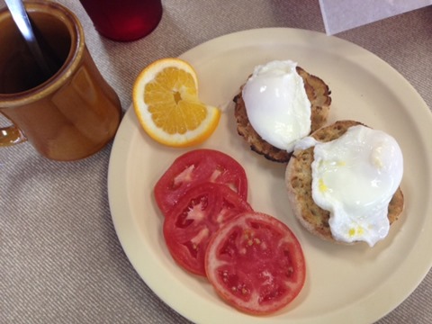 I placed my eggs on top of a buttered English muffin and topped them with tomato slices to make an egg sandwich that I enjoyed with a mug of hot coffee.