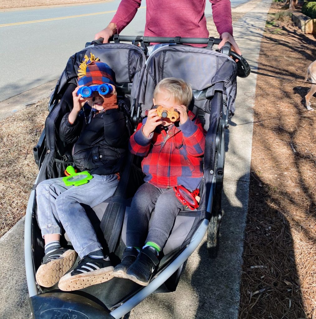 Calling our walk a “nature walk” was how we got the boys to agree to ride in the stroller (most of our walks occur with the boys on their bike or driving their Jeep these days) and we laughed because Ryder spent the whole time looking through his binoculars the wrong way.