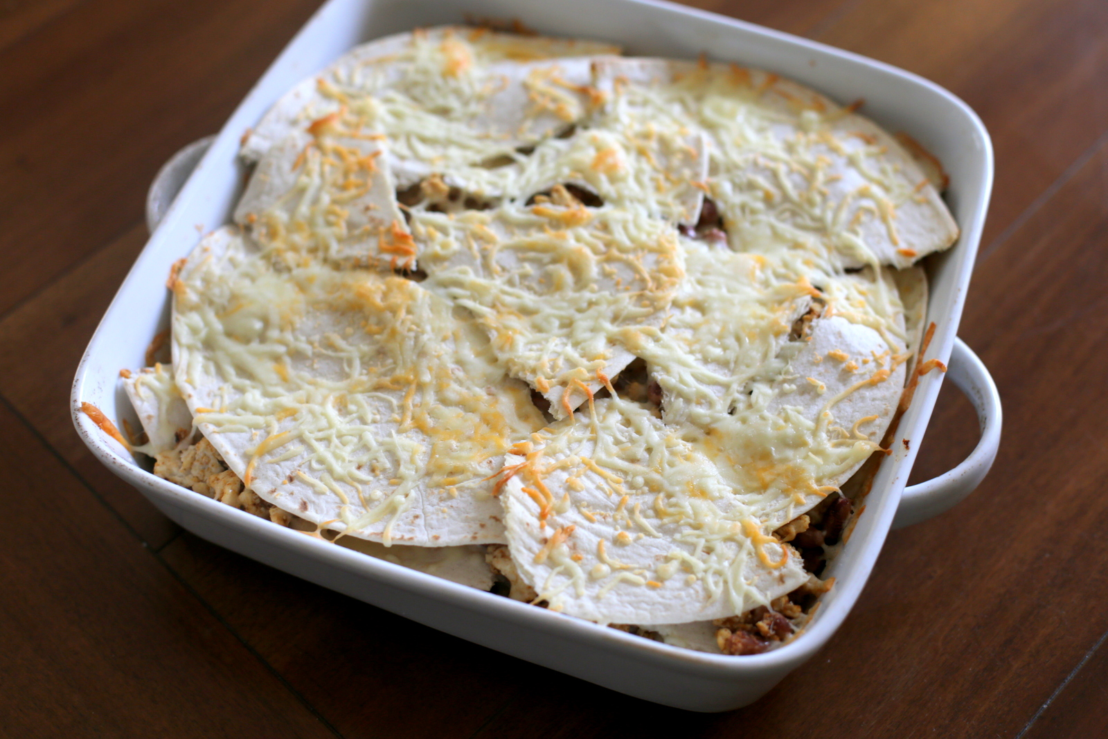 To make the recipe, preheat oven to 400 degrees. Brown one pound of ground chicken, beef or turkey in a skillet. Add 1 cup of salsa and 2 tablespoons taco seasoning to the skillet and simmer for 10 minutes. Next comes the layering! Spread about a third of the ground meat on the bottom of a baking dish and cover it with two large flour tortillas. (I had to tear my tortillas to get them to cover the meat well.) Add an additional 1/3 of the meat on top of the tortillas and then sprinkle with 1/2 can of rinsed and drained pinto or black beans and 1/4 cup shredded cheese. Top with two tortillas followed by the remaining meat and then the remaining 1/2 can of beans and another 1/4 cup of shredded cheese. Top with 2 tortillas and sprinkle with additional cheese. Cover with foil and bake for 10 minutes until cheese melts. Allow Mexican lasagna to sit for 10 minutes before digging in!