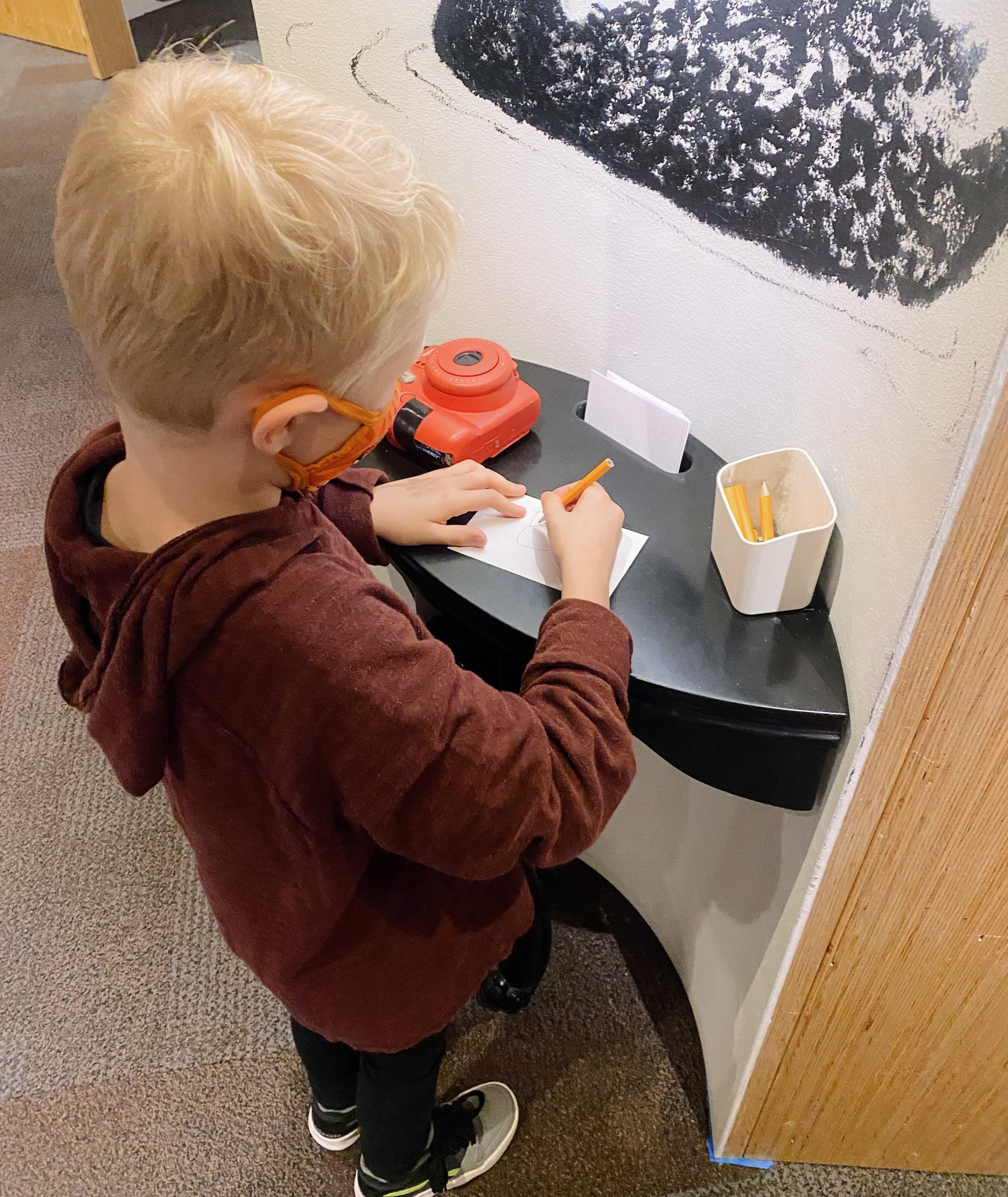During our visit, Chase brought along his little Instax Mini polaroid camera to snap pics of the animals at Discovery Place which was his main focus of our visit. (Thank you again for this amazing gift, Kim!) Ryder unfortunately lost the picture Chase took of a frog and so Chase drew a picture of his frog picture to shred in the “worry shredder” which I thought was so darn cute and the perfect example of a 6-year-old’s worries.