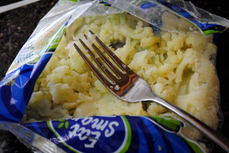 First, I steamed a bag of cauliflower in the microwave before smashing the florets with a fork.
