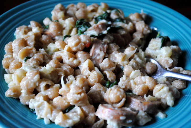 I also added spinach and two al fresco roasted pepper and asiago chicken sausages to the macaroni and cheese before serving it up!