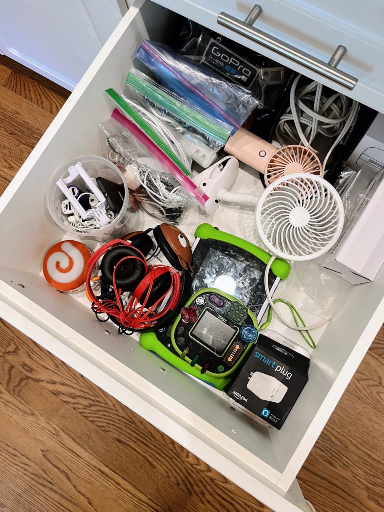 After our time at the house, we came home and tackled some organization projects around the house. One project that took me a lot longer than anticipated? Cleaning out our electronics junk drawer.