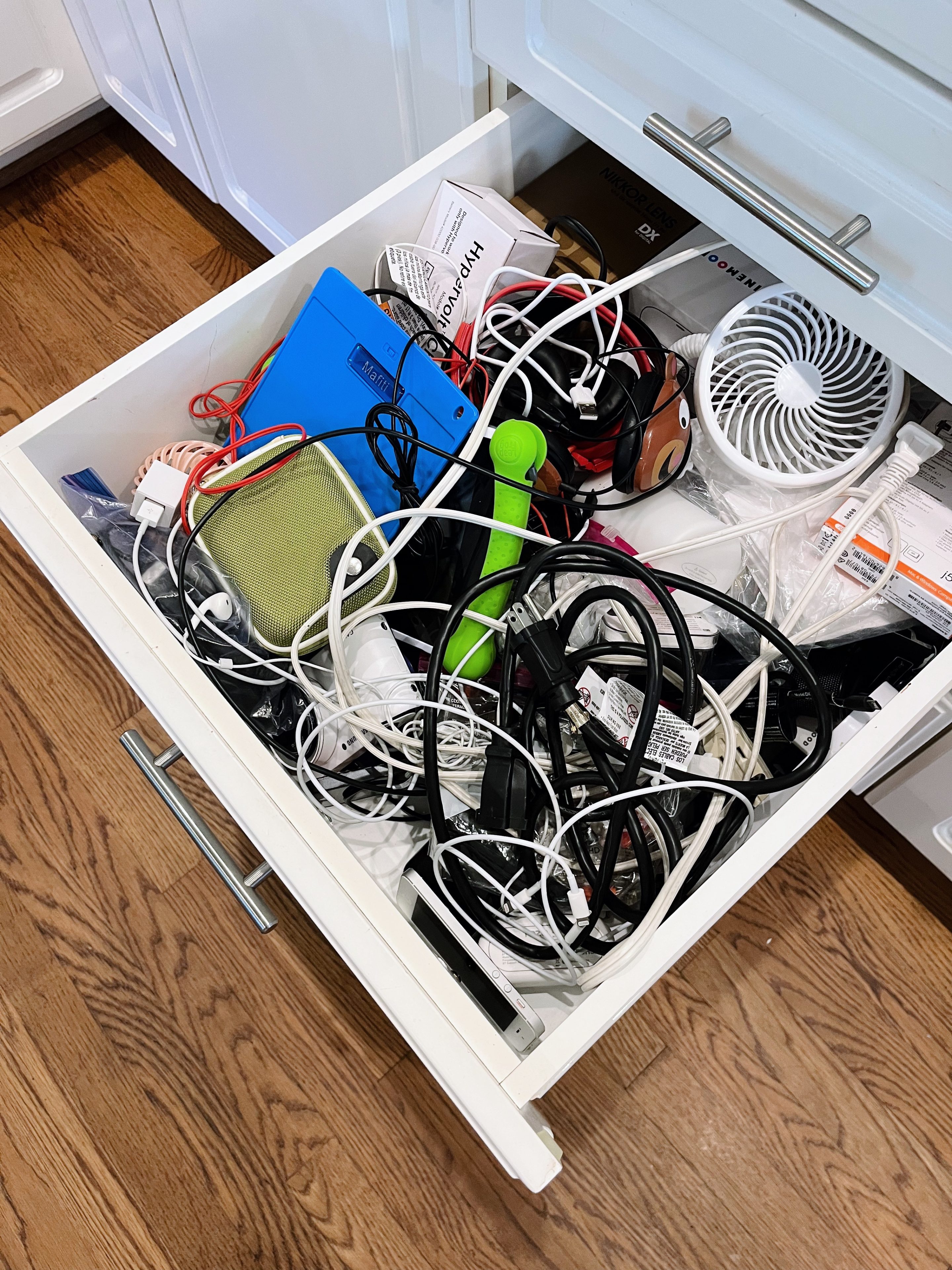 After our time at the house, we came home and tackled some organization projects around the house. One project that took me a lot longer than anticipated? Cleaning out our electronics junk drawer.