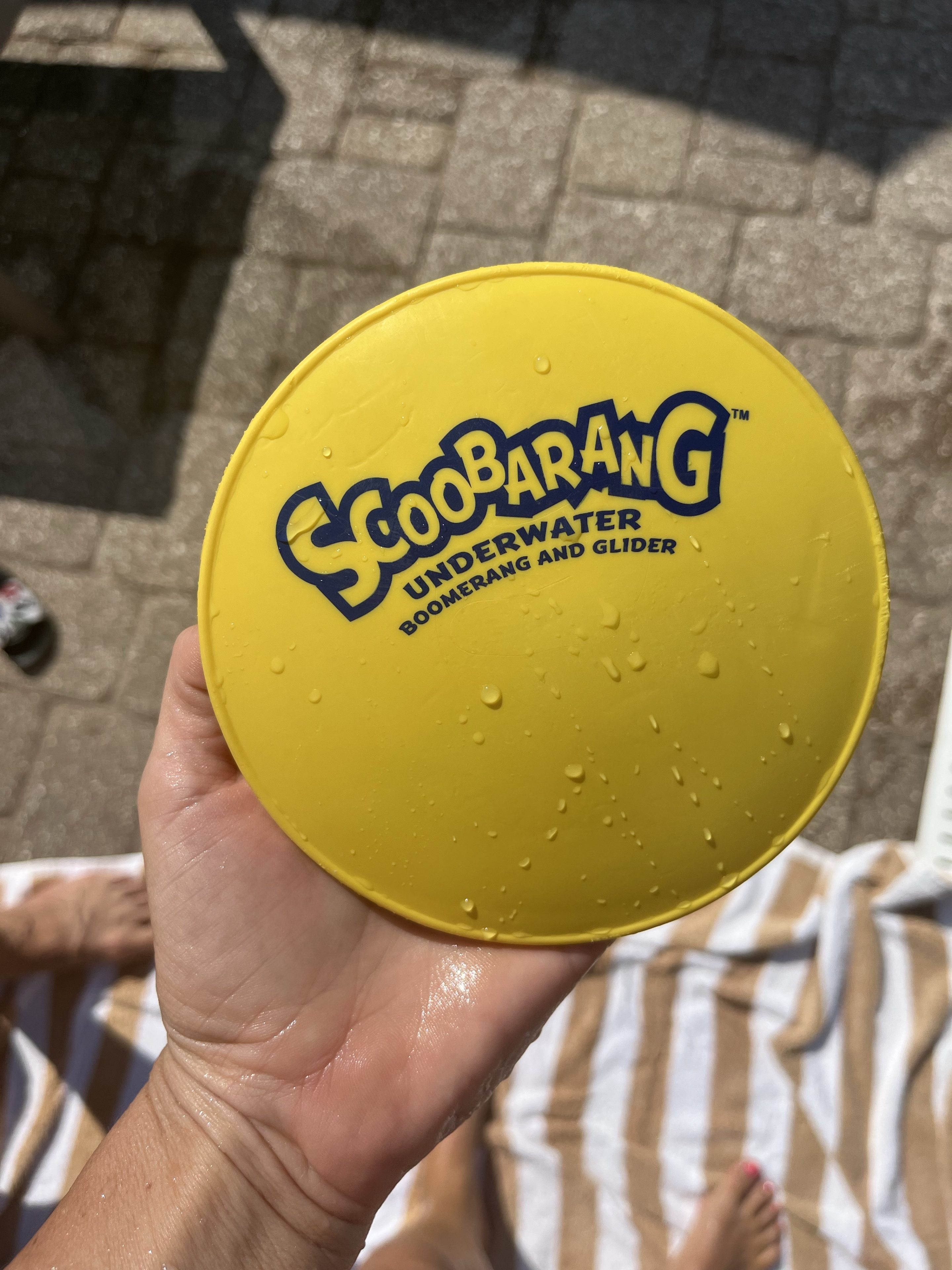 We turned it into Lost and Found before leaving but played with it for most of the afternoon because it was so fun! It is a hard little glider that easily glided across the surface of the water of the entire pool and could also be used as an underwater boomerang that would come back to you under water. We are on a mission to find one for our family even though a quick internet search makes them seem hard to find!