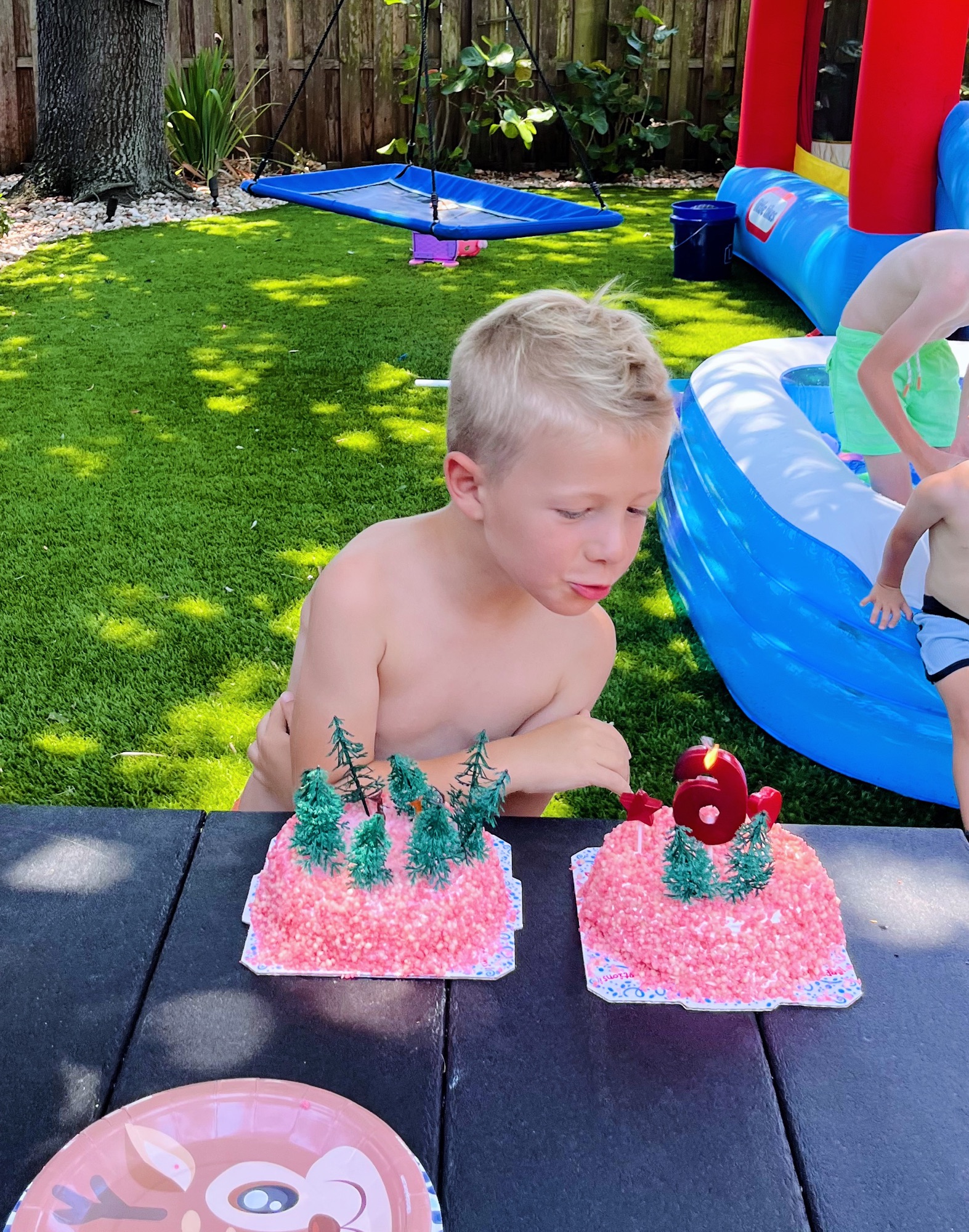 Ryder had been eyeing a strawberry ice cream cake at Publix ever since I requested an ice cream cake for my birthday back in April, so his cake was an easy one for us to select on Saturday! He wanted to help decorate it with little deer and forest figurines and I love the way his cake felt so much like him!