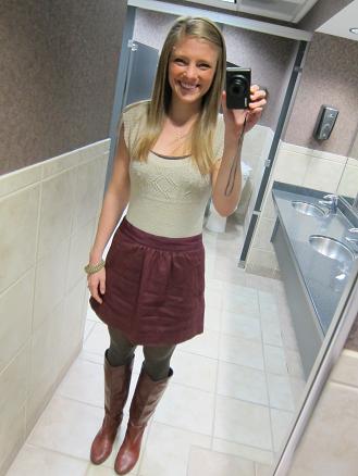 Cute outfit! The skirt totally looks like leather in the picture, not wool.