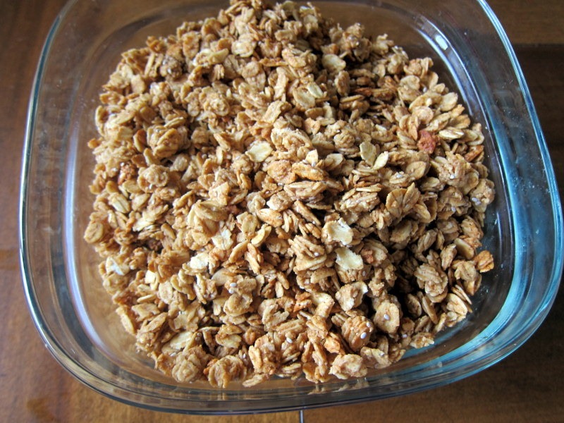 I currently have eight cups of granola on my hands! I made a bunch for Mackenzie, the winner of my granola in Gina’s Sweets for Sandy auction, and prepared a batch for us to enjoy as well.  This stuff is addicting!
