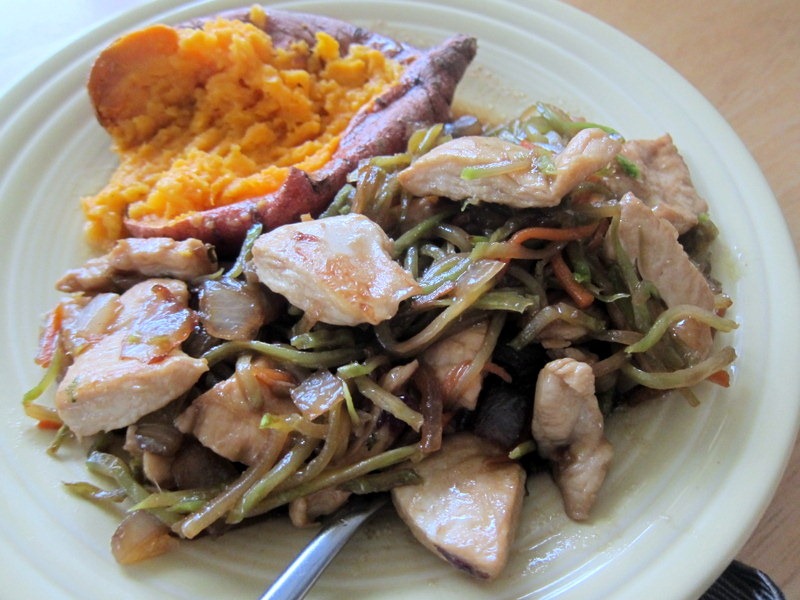 Tonight’s dinner included a sweet potato and chicken stir fry made with broccoli slaw and onions that I sautéed in a pan with olive oil, soy sauce and honey.