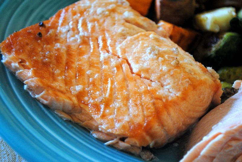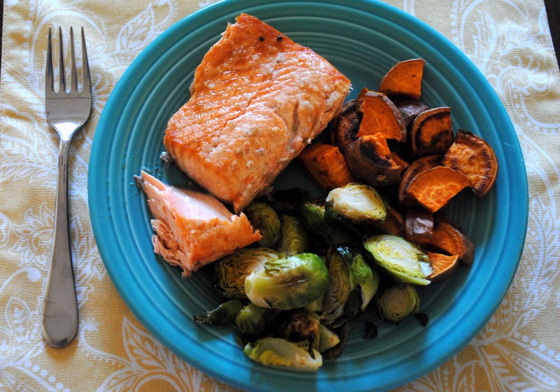 Simple broiled salmon served with roasted Brussels sprouts and sweet potato wedges.