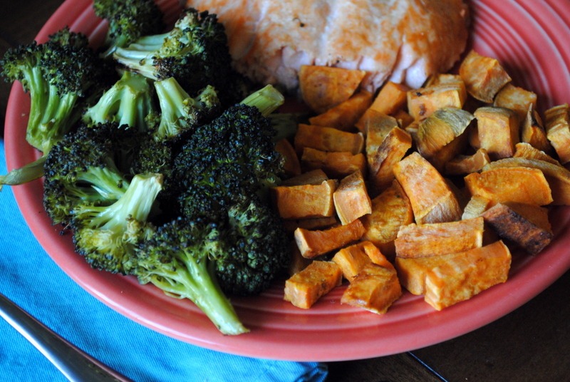 An old favorite around here: Broiled salmon, broccoli and sweet potato wedges.