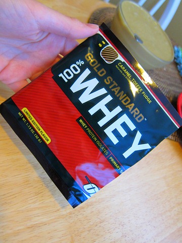 I used a packet of Gold Standard 100% whey protein powder that I bought in a protein powder sampler pack good year or two ago (through Amazon.com, I believe) in my smoothie. I don’t know why it has taken me this long to try the caramel toffee fudge flavor because, in Fergie’s words, it was d-to-the-e-to-the-l-i-c-i-o-u-s!
