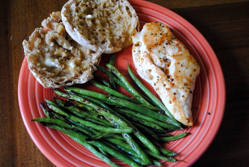 I made us mesquite chicken breasts (two for Ryan) and roasted green beans that we ate with toasted English muffins spread with a bit of Smart Balance.