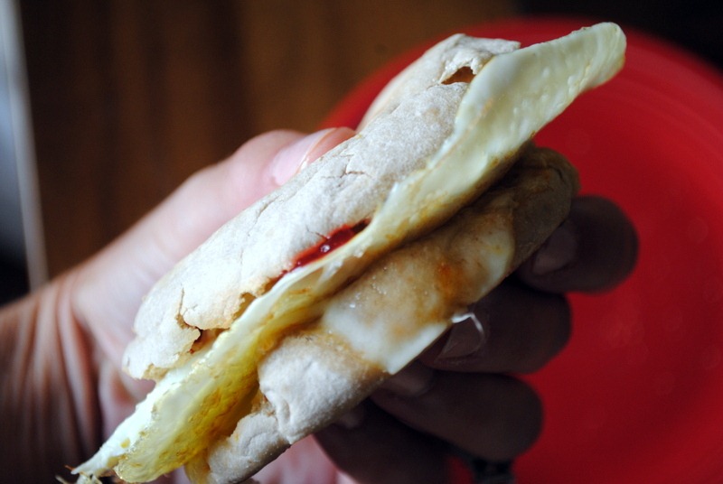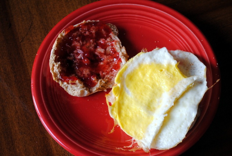 Ryan and I were both feeling eggs this morning, so I made us his and hers egg sandwiches with two fried eggs, muenster cheese and strawberry jelly.