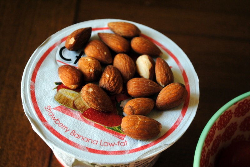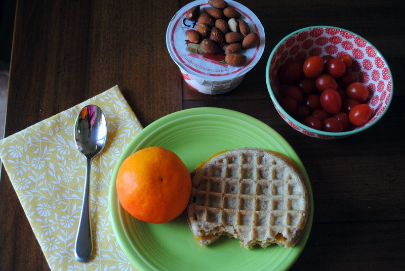 I made myself a toasted cheese wafflewich with two slices of sharp cheddar cheese and ate it along with a clementine, cherry tomatoes and a cup of Greek yogurt topped with a handful of almonds.