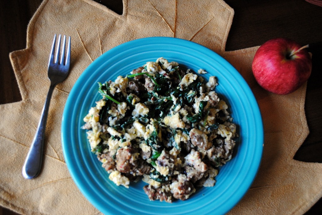Once we made it back home, I was in the mood for a savoy morning meal and prepared a batch of scrambled eggs with shredded mozzarella cheese, chicken sausage and spinach.