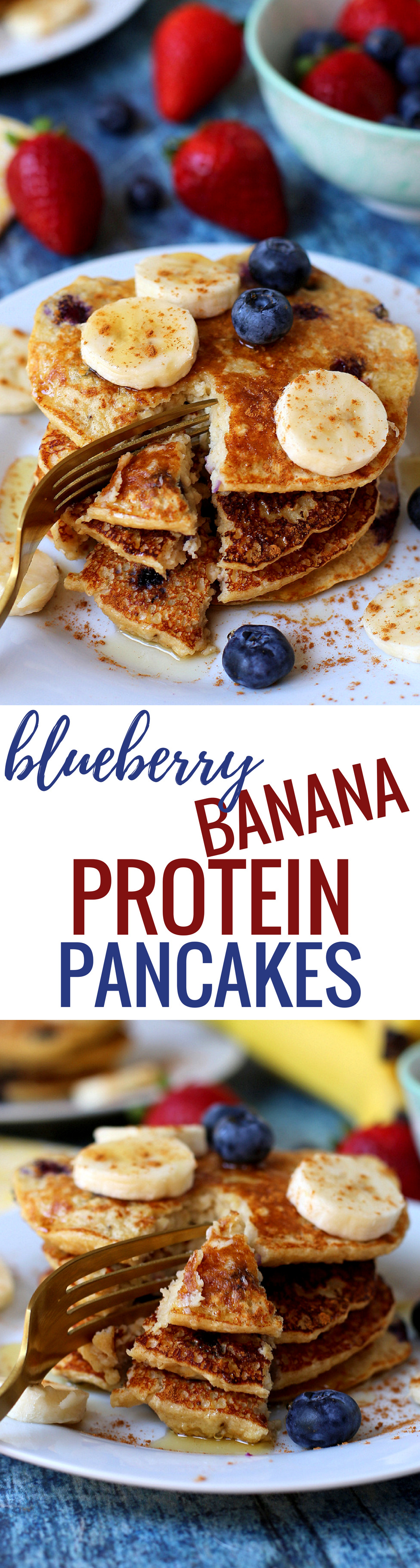 This recipe for Blueberry Banana Protein Pancakes is a Sunday morning staple every member of your family will enjoy. Naturally sweet thanks to bananas and deliciously filling, these Blueberry Banana Protein Pancakes do not require the use of any protein powder and taste delicious topped with everything from syrup and fresh berries to almond butter!