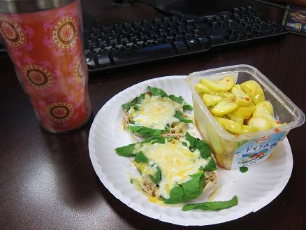 I forgot the marinara sauce I meant to pack to make English muffin pizzas. Sad day. 🙁 I still made sauce-less pizzas using fresh spinach and shredded cheese.