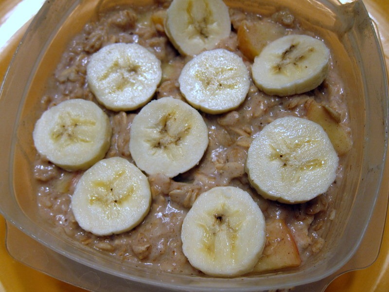 I combined oats, milk, a large sliced apple, banana slices and brown sugar and dug in.