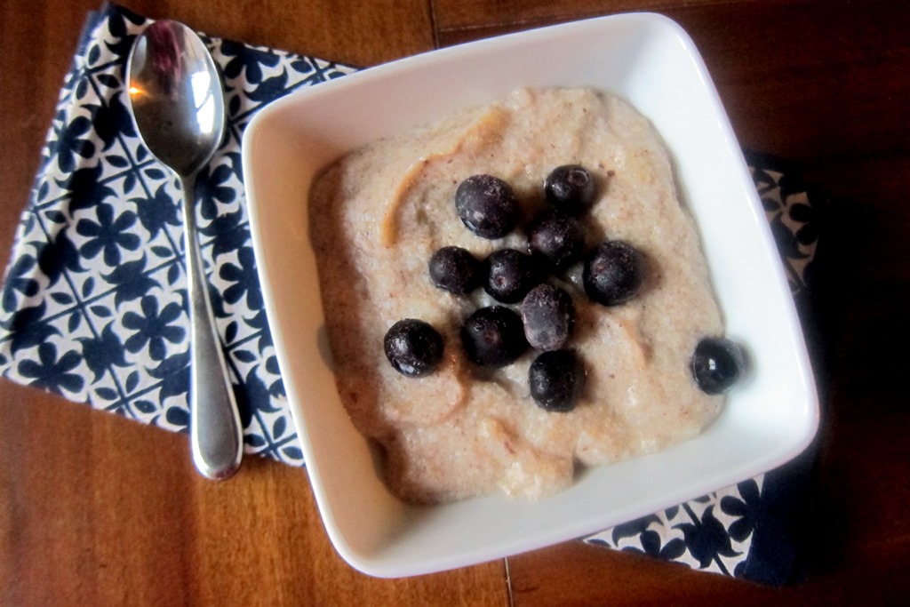 I made a bowl of the oatless oatmeal this morning and topped it with some frozen blueberries that defrosted in no time at all.