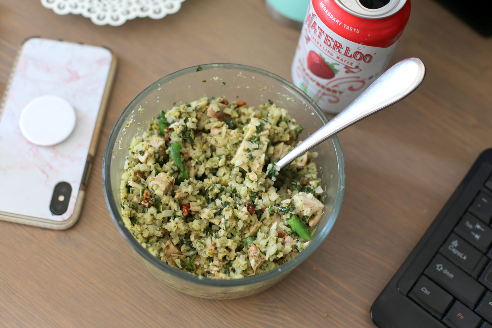 My leftovers looked like a lemon pesto cauliflower rice dish with chopped green beans, regular white rice, chicken thighs and sundried tomatoes. (I loosely followed this recipe for the lemon pesto cauliflower rice on Monday night.)
