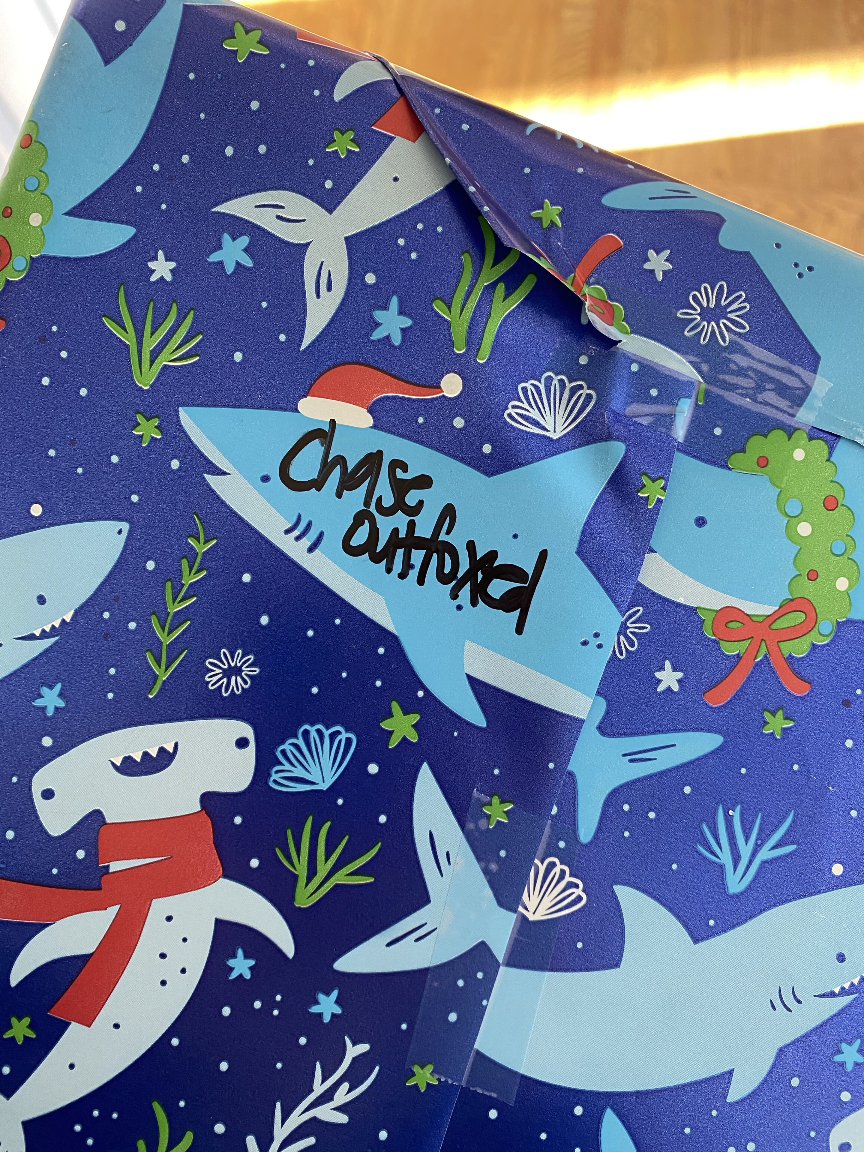 Another random thing I remember loving as a kid on Christmas that I am just beginning for our boys this year is different wrapping paper for each kid. All of Santa’s gifts were always wrapped in one kind of wrapping paper for me and one kind of wrapping paper for my sister and I had so much fun selecting wrapping paper for the boys this year! Chase’s gifts will be wrapped in holiday shark paper while Ryder’s will be wrapped in Santa T-Rex paper. (Rhett’s gifts will be unwrapped since he’s lacking unwrapping skills at the moment… and his gifts are rather limited outside of the amazing Lovevery play gym since he’s pretty darn happy with hand-me-down everything at the moment.)
