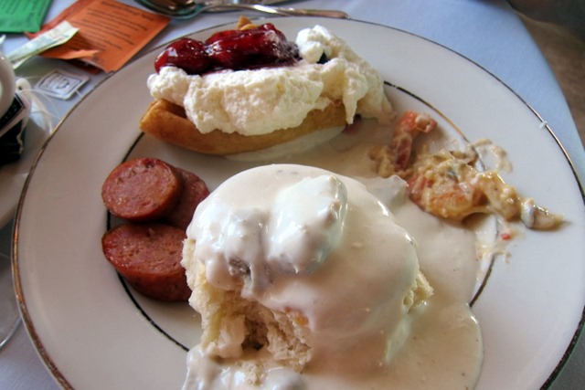 Round two included a Belgian waffle with fresh whipped cream and strawberries (Ryan’s fabulous recommendation), sliced sausage and a buttermilk biscuit with gravy.